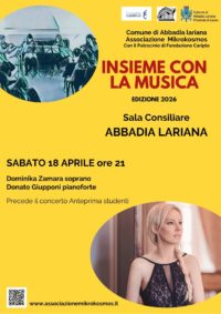 Sabato 18 Aprile ore 21:00 Sala Consiliare del Comune – ABBADIA LARIANA (LC) “Insieme con la Musica” edizione 2026 –… Leggi tutto