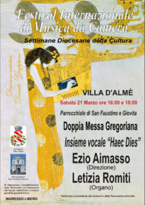 < Appuntamento da non perdere e per svariati motivi. Anzitutto un coro Gregoriano – di assoluto spessore, ormai una rarità, una vera primizia; l’apertura del “Festival Internazionale di Musica da Camera” e la possibilità di realizzare l’evento in una doppia celebrazione, dunque nel concreto dell’azione liturgica e non sganciata dalla sua funzione spirituale principale. Una dimensione autentica, che Ezio interpreta con competenza e grande discrezione. Completa l’animazione del [doppio] sacro rito Letizia, con incursioni organistiche ispirate tanto alla proposta dell’insieme vocale – fra l’altro perfettamente in linea col calendario, quanto allo splendido “Serassi 1797” della parrocchiale.>